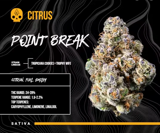 Point Break is straight-up Citrus fire—Citron and gas on the nose, with a,fruity smoke that hits smooth. These dense, frosty green nugs (with a little purple flex) bring on a smiley, euphoric high. Expect a red eye flight, That will perk you up and keep ya going. Perfect for getting those chores done.