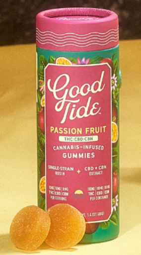 Take your mellow to the next level with Good Tide Passion Fruit THC:CBD:CBN gummies. An Indica single-strain rosin is enhanced with an extra dose of CBN and CBD’s relaxing properties and the tropical delight of passion fruit flavor to help you drift into a world of dreams.