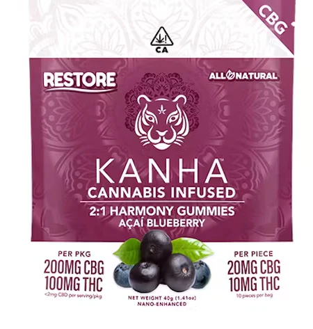 Made with real blueberry and açaí flavors, Harmony Restore delivers 20mg of CBG and 10mg of THC in each tropical gummy, boosted by our exclusive NANO technology for better absorption and faster onset times. CBG, the "mother cannabinoid" and stem cell equivalent in cannabis, is a rare compound that serves as the botanical source for THC, CBD and other cannabinoids. As one of the leading CBG products anywhere, Harmony Restore refreshes the body and soul with generous cannabinoid content and hybrid terpenes like α-humulene, β-caryophyllene and myrcene.