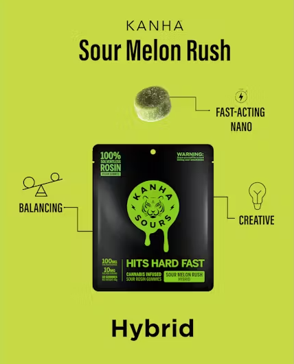 Melon flavor cranked to full volume. Each vegan gummy packs 10mg of fast-acting THC from solventless rosin of a hybrid strain. With 100mg of THC per pack, these gummies blend explosive sourness with a burst of vibrant watermelon flavor.