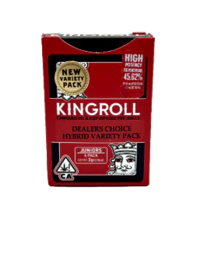 Our Dealer's Choice Variety packs each contain 4 unique Kingroll strains of our .75g Kingroll Jr infused Prerolls. Every Kingroll is handcrafted blending two unique and complementary flavors to taste: our premium whole-nug flower and Kingpen’s award-winning oil. Our cultivation and distillation teams work together to pair each unique flavor. Kingroll strains are small batch and will rotate with harvest. Dealer's Choice Multipacks are perfect for consumers looking to experience multiple new strains from our rotating cultivars.Sour Breath x Blue Dream, Trainwreck x Maui Wowie, ATF x Cali-O, XJ-13 x Pineapple Express
