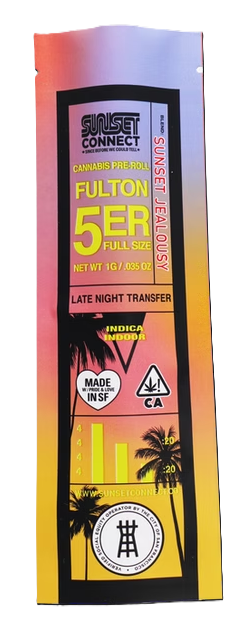 Get ready to giggle your way into bliss with the Sunset Jealousy Fulton 5'er. This indica dominant blend is like a warm hug from a long-lost friend who happens to be hilarious. It's the perfect mix for those evenings when you just want to kick back, relax, and find the humor in everything.